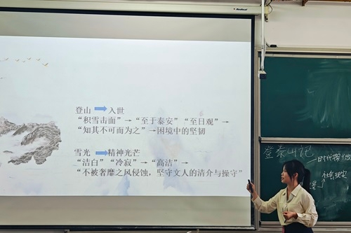 教学综合技能组在5B301、5B302、5B303教室开展,包含即席演讲、教学设计及课件制作、模拟授课三个板块,全面考查师范生教学综合素养。选手尹星璐以“踏雪寻微——探秘《登泰山记》的隐喻世界”为题,深入分析冰雪隐喻下的自然实景、社会现实、文人精神,指出该文不仅是游记,更是时代镜子与精神丰碑。其讲解逻辑清晰、见解独到,赢得好评。经过激烈角逐,选手尹星璐、李嘉欣荣获本组比赛一等奖。