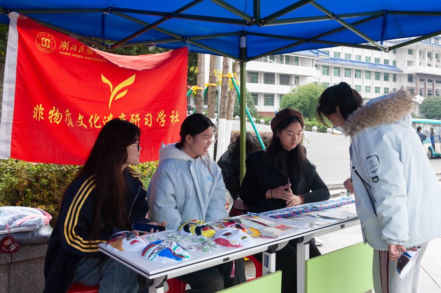 本网讯(记者 廖红娟 龙琪(见习)李蓉华(见习) 韩璐(见习)/文 林必幸子 曹登霄(见习)/图)12月18日,非物质文化遗产研习学社在大学生广场开展以“土锦傩韵进校园,非遗魅力永相传”为主题的特色活动,吸引众多师生参与。