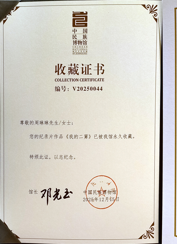 本网讯(通讯员 周琳琳 邓高锋 )近日,广播电视编导专业学生周琳琳创作的纪录片《我的二舅》被中国民族博物馆永久收藏,这不仅标志着一位本科生导演的专业能力获得国家级专业机构的认可,更是我院实践教学与学术创作成果的一次突出展现。纪录片《我的二舅》收藏证书纪录片细致记录了当“二舅”身患...