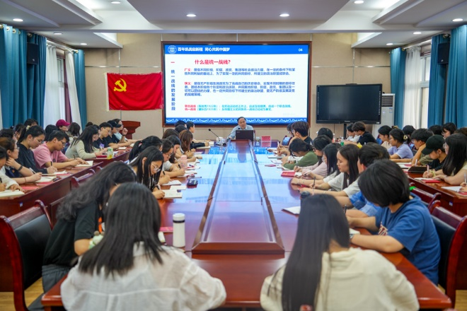 2024-05-30本网讯(记者 陈梓灵/文 记者 刘晓微 杨汝霞/图)5月22日,学校党委常委、统战部长田景福在文学与传媒学院智慧教室一讲授主题为“百年统战启新程 同心共筑中国梦”的党课。学院副院长江佳慧、学生科老师王修皓、2024年春季发展对象参加课程。江佳慧主持理论课。学习现场田景福授课 田景福从统一战...