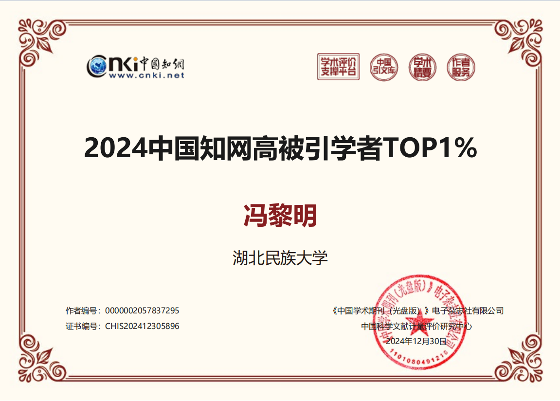本网讯(通讯员 郑泽红)近日,中国知网下属的中国科学文献计量评价研究中心基于中国知网收录的国内学术成果,首次开展学者学术影响力客观评价,遴选了“2024中国知网高被引学者”名单,我院冯黎明教授入选2024中国知网高被引学者Top1%。“中国知网高被引学者”遴选活动旨在客观、科学衡量并表彰近十...