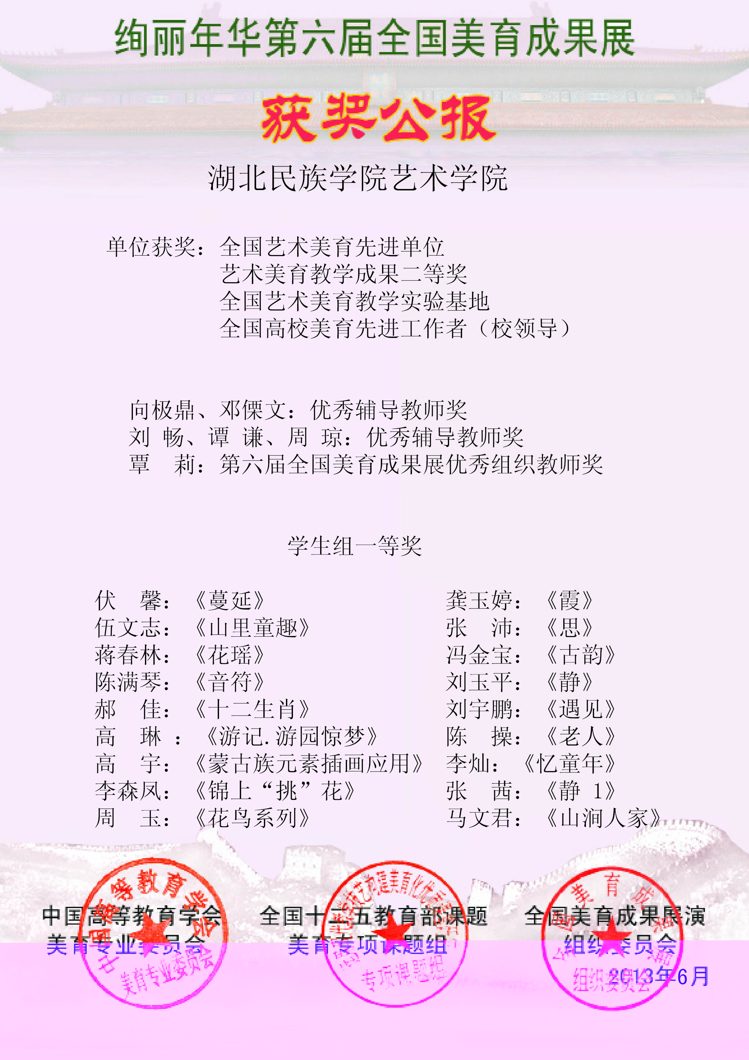 艺术学院学生在中国高等教育学会美育专业委员会组织的第六届全国美誉成果展中获多项奖项。