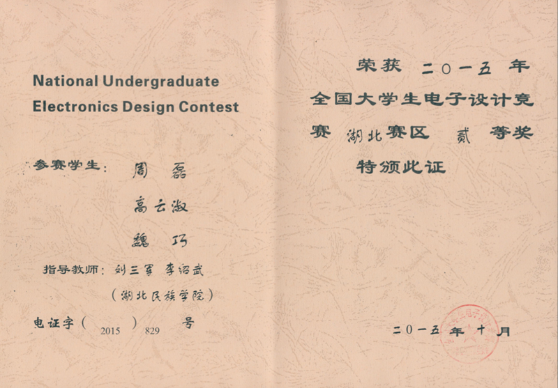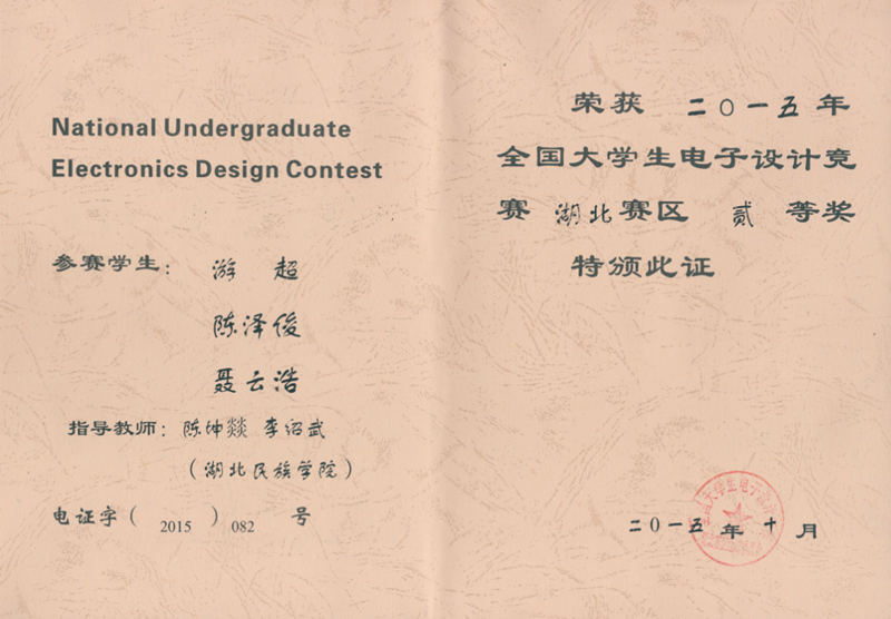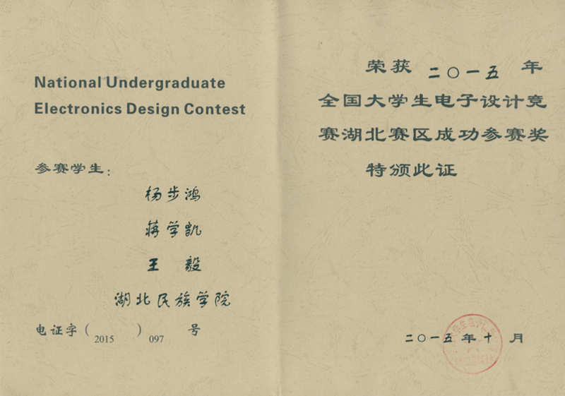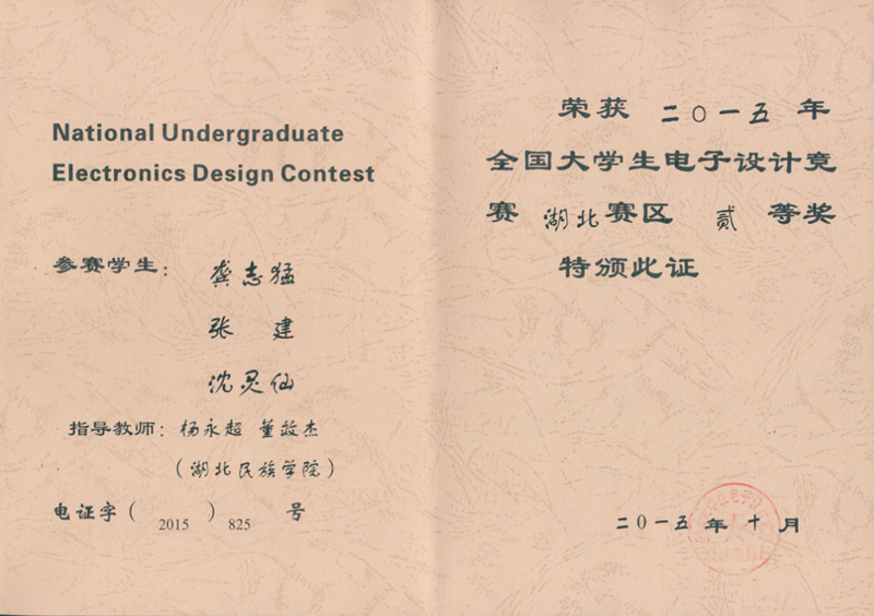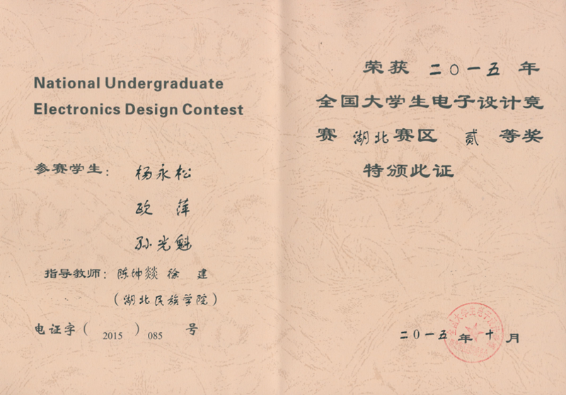 全国大学生电子设计竞赛是教育部倡导的大学生学科竞赛之一,面向大学生的群众性科技活动,目的在于推动高等学校促进信息与电子类学科课程体系和课程内容的改革。竞赛的特点是与高等学校相关专业的课程体系和课程内容改革密切结合,以推动其课程教学、教学改革和实验室建设工作,有助于学生工程实践素质的培养、提高学生针对实际问题进行电子设计制作的能力;有助于吸引、鼓励广大青年学生踊跃参加课外科技活动,为优秀人才的脱颖而出创造条件。自2001年开始由信息工程学院选拔学生进行培训代表我校第一次参加该项赛事以来,获得了国家二等奖、湖北省特等奖、一、二、三等奖及优胜奖等各类奖项共计100余项。