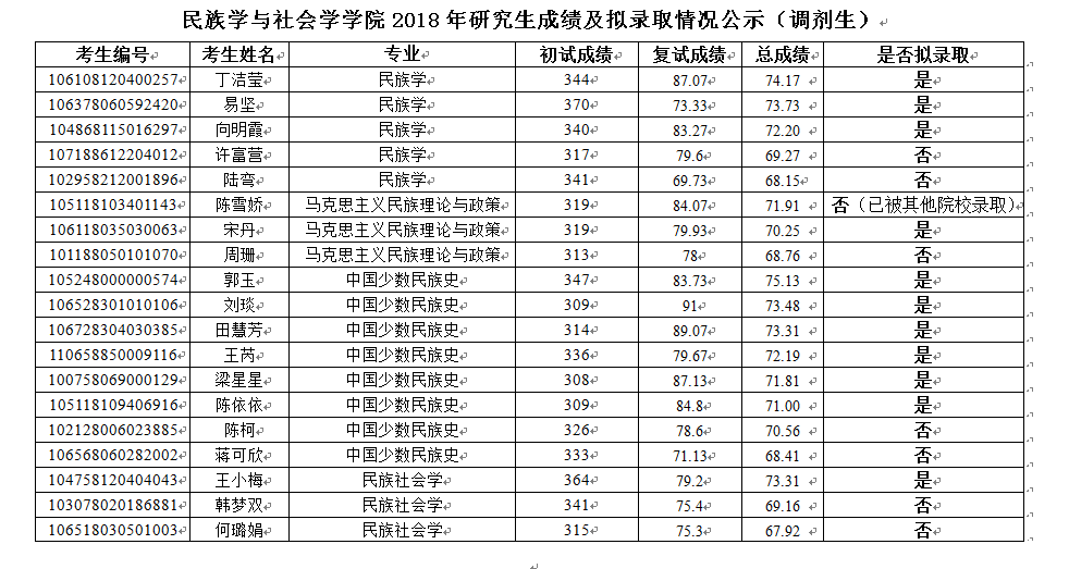 民族学与社会学学院2018年研究生成绩及拟录取情况公示(调剂生)