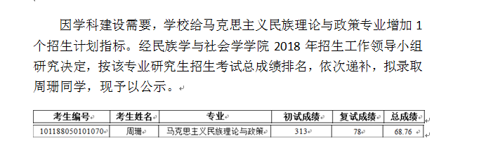 民族学与社会学学院2018年补录硕士研究生名单公示(二)