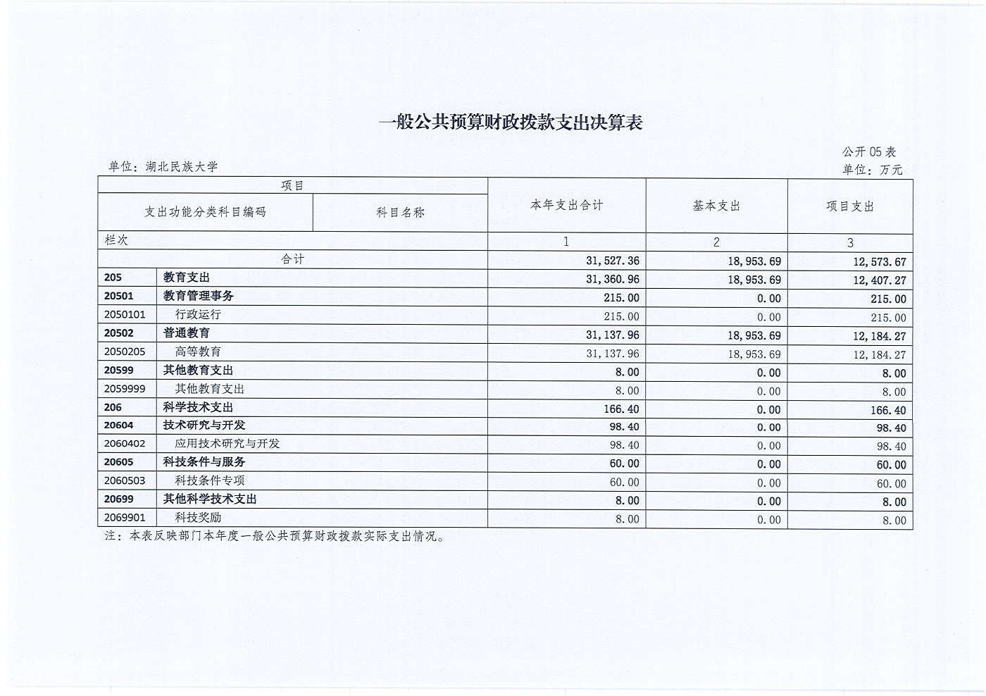 2.高等教育(2050205): 反映的是经国家批准设立的中央和省、自治区、直辖市各部门所属的全日制普通高等院校(包括研究生)的支出。