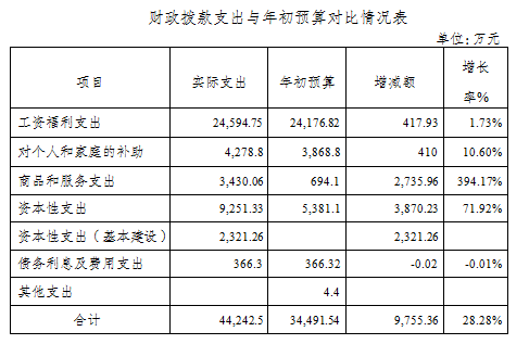 按经济分类具体明细为:工资福利支出24,594.75万元,比年初预算增加417.93万元,增长1.73%;对个人和家庭的补助4,278.8万元,比年初预算增加410万元,增长10.6%;商品和服务支出3,430.06万元,比年初预算增加2,735.96万元,增长394.17%;资本性支出9,251.33万元,比年初预算增加3,870.23万元,增长71.92%;资本性支出(基本建设)2,321.26万元,比年初预算增加2,321.26万元;债务利息及费用支出366.3万元,比年初预算减少0.02万元,降低0.01%。财政拨款支出与年初预算对比情况如下表: