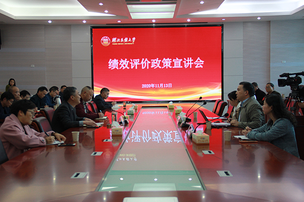 本网讯(通讯员 何寿伦/文 记者 谷祥裕/图)为进一步加强财政支出绩效评价工作,11月13日下午,学校在行政楼3号会议室召开绩效评价政策宣讲会。湖北省财政厅预算绩效管理处副处长宋金涛、熊亚芬和科长冯妍妍作绩效评价政策辅导报告,会议由学校党委副书记、校长顿祖义主持。学校各二级学院(部)、附属民大医院行政负责人及具体负责绩效评价人员,各职能部门主要负责人,财务处全体人参会。