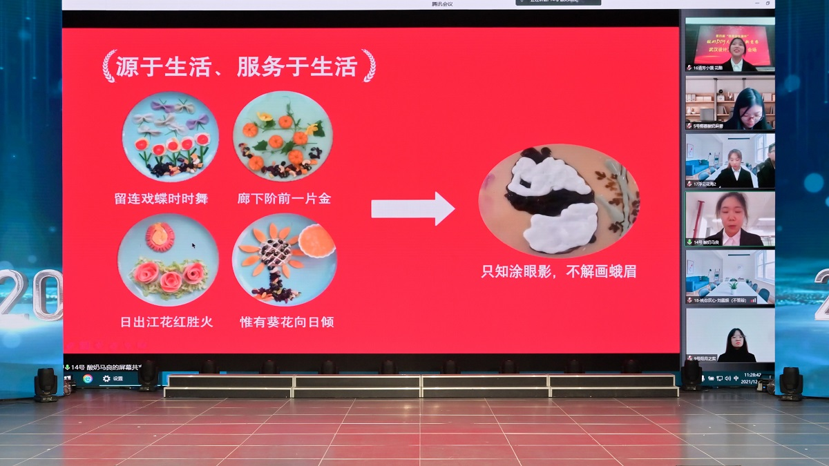 在决赛展示与答辩环节,来自武汉设计工程学院的作品“浮云花海”主要考察感官标准、微生物标准等,该团队采用现代高科技技术,结合传统祥云图案设计产品外观。评委从色、香、味等方面进行评价。来自我校的“酸奶马良趣涂鸦”小组采用健康原料,运用大熊猫涂鸦元素体现产品特色,并将酸奶与早教相结合,兼具创新性与趣味性。评委建议选手将糖醇和甜味剂搭配使用,让产品产生更好的效果。来自华中农业大学的“渣”芯彩团从西藏的奶渣与酥油中获取灵感,并通过设计文化产品的方式传承美食文化、弘扬传统文化。