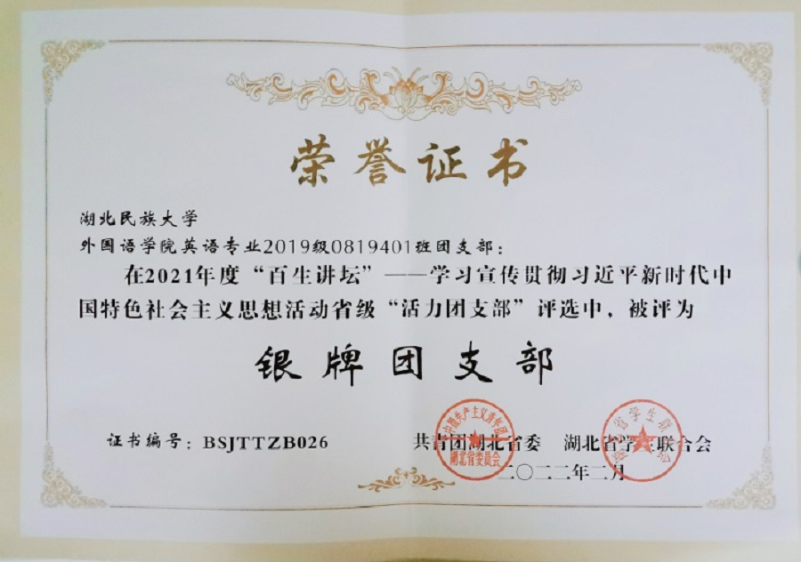 近日,共青团恩施州委对2021年度“两红”“两优”进行通报表扬,我校外国语学院团总支荣获“恩施州五四红旗团支部(总支)”称号。