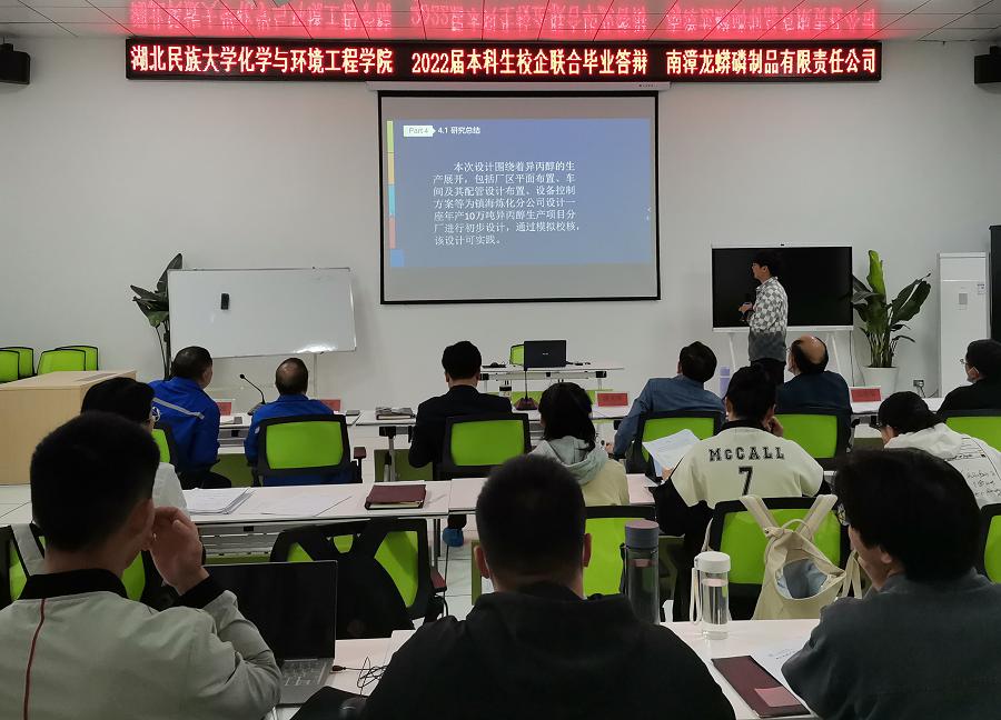 5月14日,化学与环境工程学院在湖北襄阳南漳龙蟒磷制品有限责任公司举行“校企联合”毕业论文答辩会,特别邀请企业代表作为答辩委员会专家,为化学工程与工艺、制药工程专业在该公司实习的11名毕业生进行了一场特别的毕业论文答辩。