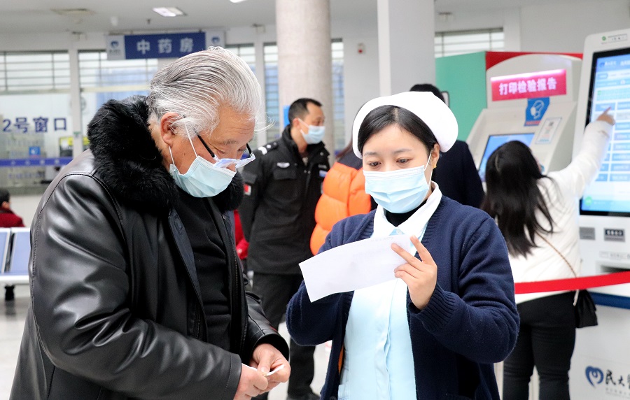 导诊人员帮助老年患者查看检验结果