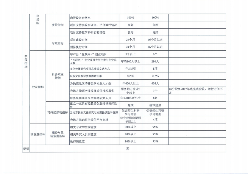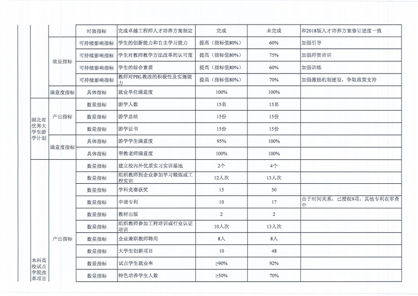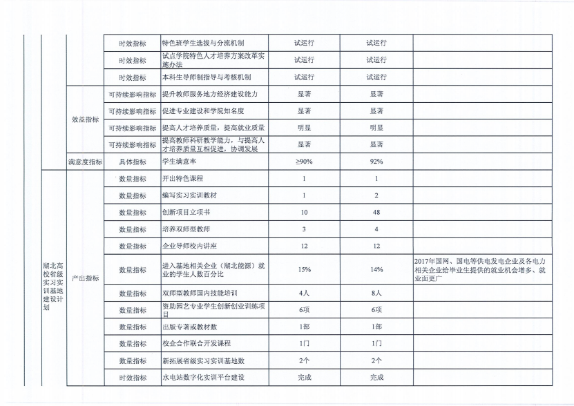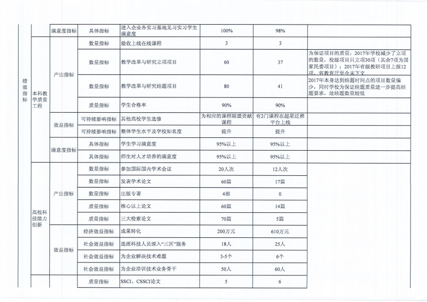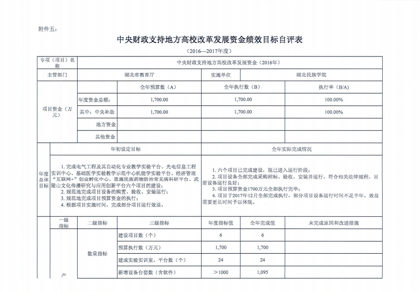 中央财政支持地方高校改革发展资金绩效自评综述:项目全年预算数1,700万元,项目执行期为2016-2017年,预算执行率100%。主要产出和效果:本次自评工作共完成22项具体绩效指标评价,其中产出指标9项、效益指标10项、满意度指标3项。绩效指标总体完成21项,完成率95.45%,其中产出指标和满意度指标全部完成,效益指标完成9项,完成率90%。发现的问题及原因:“为地方能源产业发展提供技术服务”指标属于社会效益指标,未完成的主要原因,是项目必需的部分设备2017年底才完成验收,运行时间不足导致绩效目标未能实现。绩效目标需在持续运行时才能实现。下一步改进措施:后续学校将进一步加强项目后期运行管理,充分发挥项目的功能,提升项目服务质量。