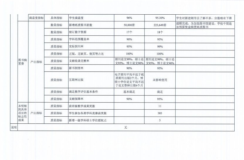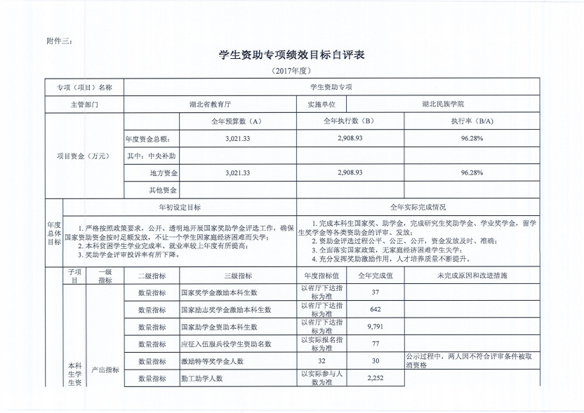 学生资助专项绩效自评综述:项目全年预算数3,021.33万元,执行预算2,908.93万元,完成预算的96.28%。主要产出和效果:项目年初绩效产出指标共计19项,完成产出指标14项,完成率73.68%,年初设定的产出目标基本完成。发现的问题及原因:特等奖学金发放人数和研究生助学金发放金额未全部实现,主要是在评审过程中部分评审对象不符合政策规定,最终未实际发放奖助金。研究生考取博士生人数、省级优秀硕士论文未实现的主要原因是学校在设定年初目标值时对学生考博率设置较高,但学生毕业后就业意愿强,推迟了参加博士考试时间。下一步改进措施:学校在编制年初目标时要更加适当、可行,在日常管理中,提高学生培养质量。