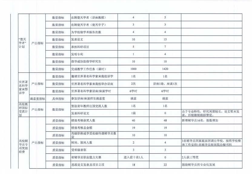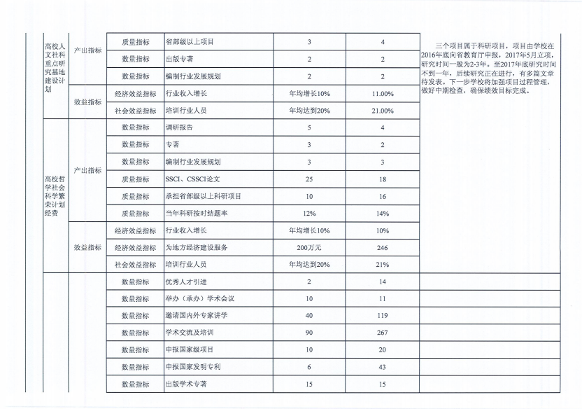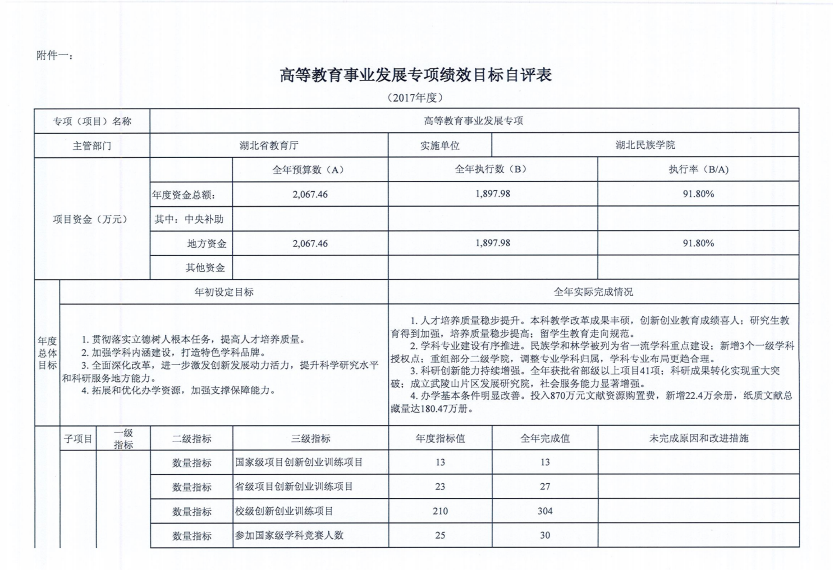 高等教育事业发展项目绩效自评综述:项目全年预算数为2,067.46万元,执行数为1,897.98万元,完成预算的91.80%。主要产出和效果:一是项目绩效产出指标共计147项,实际完成产出指标123项,完成率83.67%;二是项目绩效效益指标共计21项,实际完成产出指标17项,完成率80.95%。发现的问题及原因:科研项目研究周期较长,一般在2-3年,后续研究的产出目前尚无法统计,导致科研项目绩效目标未全部完成。下一步改进措施:一是加强科研项目后期跟踪管理,强化督导考核,对绩效目标未实现的科研项目不予结题,并将绩效目标完成情况与项目负责人后期课题申请、科研资金分配等挂钩考核;二是在下年度设定科学研究类绩效目标时充分考虑项目特性和实施具体情况,更加科学合理的设定年初绩效目标。