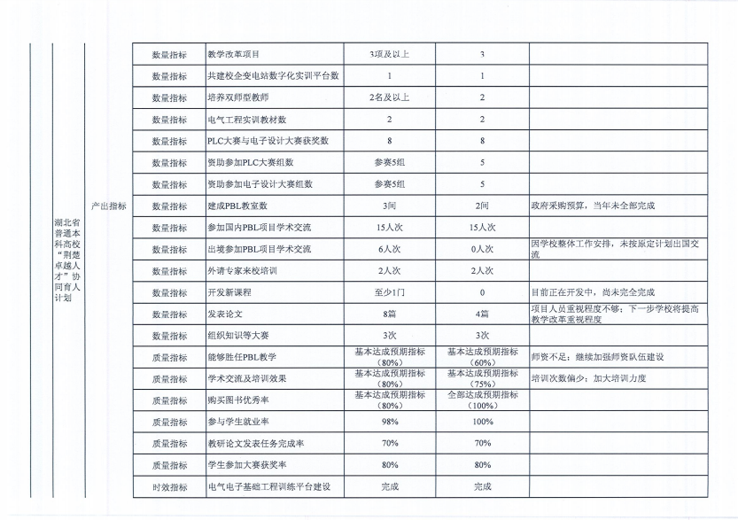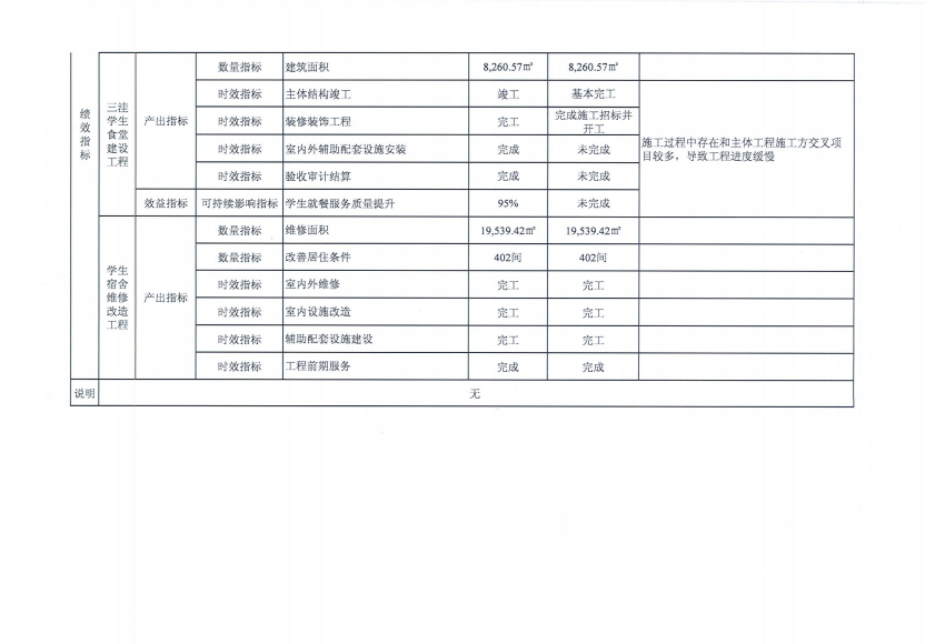 基本建设专项绩效自评综述:项目全年预算数1,760.99万元,执行数1,760.99万元,完成预算的100%。主要产出和效果:本次自评工作共完成17项具体绩效指标评价,其中产出指标16项、效益指标1项。经评价,绩效指标总体完成9项,完成率53.94%,其中完成产出指标9项,完成率56.25%;效益指标目前未完成。发现的问题及原因:一是年初设定目标时未充分考虑工程招标周期、招标流标、天气等不可抗力因素对绩效目标完成情况的影响,导致年初设定目标偏高;二是对依赖土建等主体工程完工后才能继续开展的装饰工程、验收审计等进度预计不够,由于主体工程完工时间较晚导致后续装饰工程、验收审计等绩效指标未完成绩效目标。下一步改进措施:以后在设定该类指标年初绩效目标时,学校将更加实事求是、科学规划,充分考虑各种因素对工程进度的影响,按项目实施的实际情况制订绩效目标。同时,学校也将进一步加强基本建设工程管理,理顺内部工作机制,切实保障项目实施进度。
