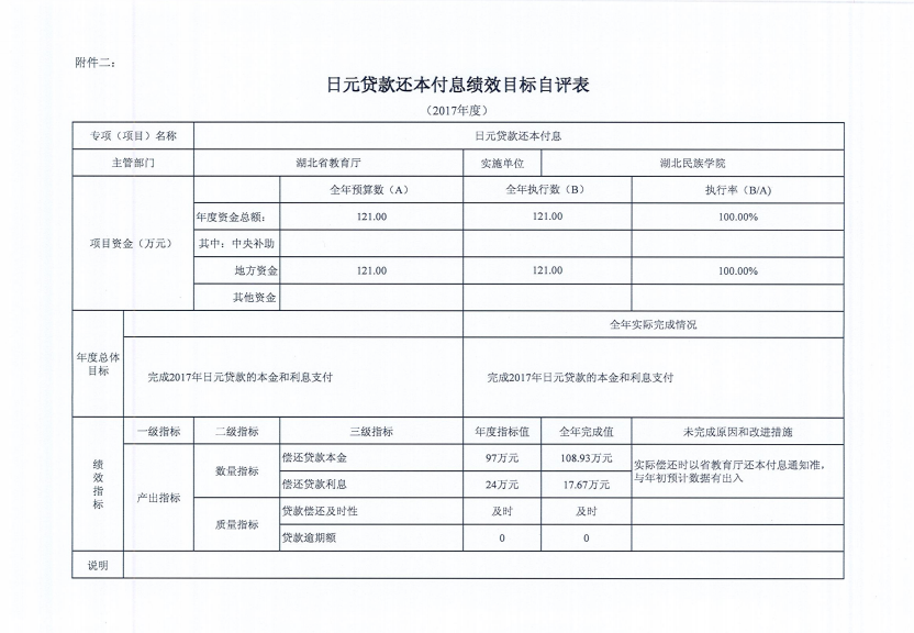 日元贷款项目绩效自评综述:项目全年预算数121万元,执行数121万元,完成预算的100%。本次自评工作共完成4项具体绩效指标评价,4项指标全部为产出指标,完成率为100%,及时偿还了2017年贷款本金与利息,无贷款逾期。