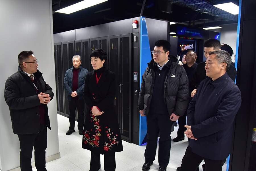顿祖义(右一)陪同向红林(左三)、马霄鹏(左四)等参观云数据中心机房