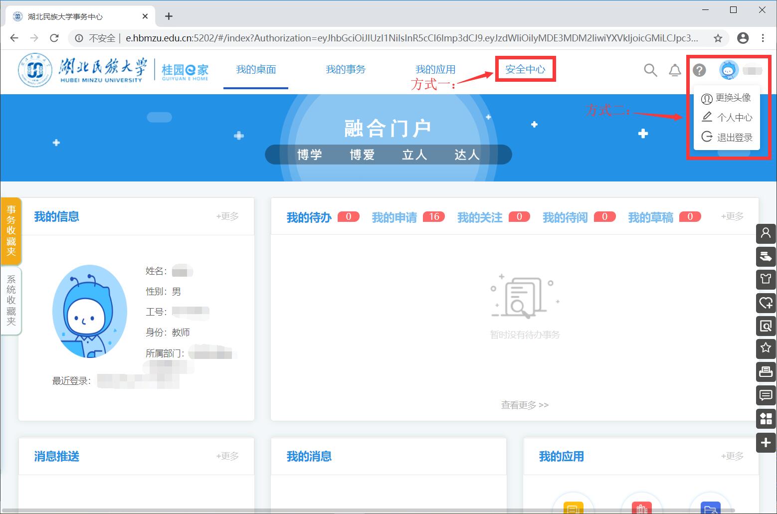 四、登录成功后在界面中点击“安全中心”,或点击右上角个人姓名选择“个人中心”,进入安全中心界面,如图 3所示;鼠标移至“密码管理”,点击下拉菜单“修改密码”进入修改密码界面,如图 4所示