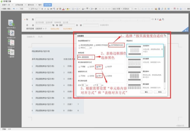 第四步:1、选择“按页面宽度自适应”等自动调整表格尺寸;2、设置表格边框颜色为黑色或其它颜色;3、根据需要设置“单元格内容对齐方式”、“表格对齐方式”、“单元格内边距”等
