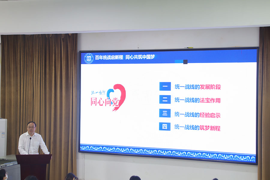 田景福以“百年统战启新程,同心共筑中国梦”为主题,围绕统一战线的发展阶段、法宝作用、经验启示、筑梦新程四个方面,全面回顾了统一战线的定义、性质、构成、范围、重要法宝作用,系统总结了中国共产党同民主党派团结合作的奋斗历程。他指出,统一战线在全面建设社会主义现代化国家,实现中华民族伟大复兴的筑梦新程中具有不可替代的作用,新时代统战工作应有所为、大有可为。