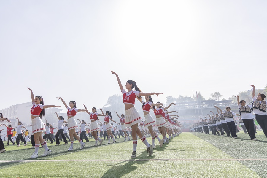 开幕式后,首先进行民族健身操表演。各学院部的民族健身操方阵身着各色服装,健步入场进行表演。他们动作整齐划一、协调一致,在活力四射的舞步中呈现异彩纷呈的民族文化特色和青春奋进力量,展示了民大学子的进取姿态和昂扬风貌,生动体现了少数民族传统体育文化精神和内涵。