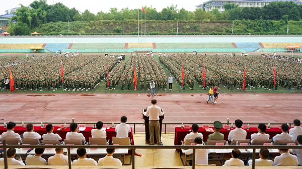 开学典礼暨军训动员大会校歌《壮志凌云》奏唱中圆满落下帷幕。全体2018级新生大学生活第一课——为期14天的军训正式拉开序幕。