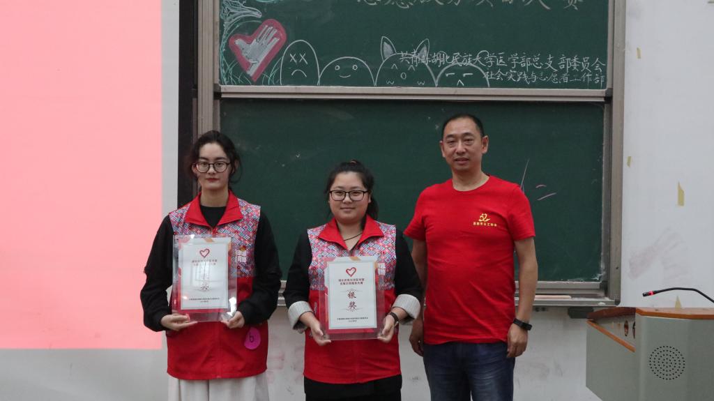 (本网讯 通讯员 袁子涵 许旖蕾/文 摄影 李湘 李东 曾凡轩/摄)为进一步弘扬志愿服务精神,宣传志愿服务理念,引导大学生在服务社会的实践中受教育、长才干、做贡献,5月28日,医学部在修远楼5B404教室联合开展第一届志愿服务项目大赛。此次活动由医学部团总支社会实践与志愿者工作部及医学部青年志愿者协会主办。恩施义工协会发起人向波,副会长汪娜,恩施州残友之声志愿帮扶协会会长严明君,医学部党委书记黄晓波,音乐舞蹈学院团总支书记单家迪,医学部学生工作办公室老师袁琳、陈建萍应邀出席并担任评委。现场观众200余人。
