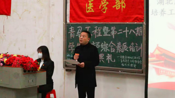最后,医学部党委常务副书记廖云老师致辞并宣布第三期青年马克思主义者培养工程暨第二十八期学生干部综合素质培训班正式开班。廖云老师在发言中提出,作为新一代青年,同学们不要选择“躺平”,不要自暴自弃,要坚持学习,强化自己的判断力,要始终坚持自己的理想,在自律中找到自己的人生方向,不要在吃苦的年纪选择安逸,而要在风华正茂的年纪中努力奋斗。他希望同学们能够在此次的青马课程中能够学有所获,努力成长为一名合格的接班人。
