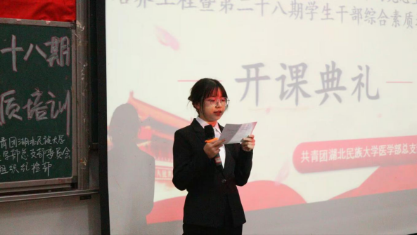 伴随着慷慨激昂的团歌,医学部第三期青年马克思主义者培养工程暨第二十八期学生干部综合素质培训班开课典礼正式开始。首先,由优秀团员代表张恬同学带领全体成员面向团旗庄严宣誓。接下来,由医学部团总支组织纪检部谢文菁同学宣读《医学部第三期青年马克思主义者培养工程培训班培养方案》,增进同学们对青马工程的了解。往期青年马克思主义者培养工程培训班优秀学员代表胡梦羽同学紧接着发言:青春是有限的,智慧是无限的,我们要以短暂的青春去学习无穷的智慧。鼓励同学们要努力奋斗,争做合格的青年马克思主义者。而后新生学员代表胡钊同学上台发言:作为青年学子,我们要自觉践行马克思主义,立志做坚定的马克思主义者,不断坚定马克思主义信仰和共产主义理想,切实把理想信念建立在对科学理论的理性认同上。