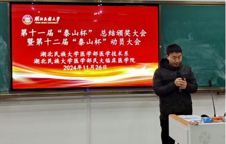 11月26日,医学影像技术专业第十一届“泰山杯”总结颁奖大会暨第十二届“泰山杯”动员大会于民大临床学院圆满举行,此次大会不仅是对过去一年辛勤耕耘成果的回顾,更是对未来征程的展望与动员。医学部副主任、医学技术系王松主任,医学部副主任陈磊,民大医院副院长冉瑞金,医学影像技术专业负责人向辉华,民大医院放射科技术组组长胡春阳,放射科乐敏莉、张华伍、杨早及医学部医学影像技术专任教师旷香琴参加了本次会议。参加本次会议的还有第十一届“泰山杯”参赛同学及医学影像技术专业22级全体同学,会议由民大医院教学科主任黎学兵主持。