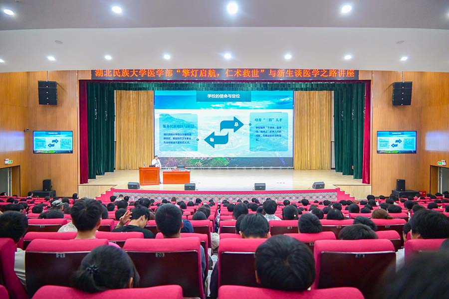 为传承医学精神、启迪从医初心,帮助新生明确医学学习方向与职业使命,9月25日,365电子娱乐官方网站医学部特邀恩施州政协主席吴建清,在新区多功能报告厅开展“擎灯启航,仁术济世——与新生谈医学之路”专题讲座。吴建清以“老学长”“老教师”的双重身份,结合自身四十年从医与求学经历,从医学本质解析、民大精神领悟、学习路径规划等多维度,为医学新生上了一堂生动的“医学启蒙课”。