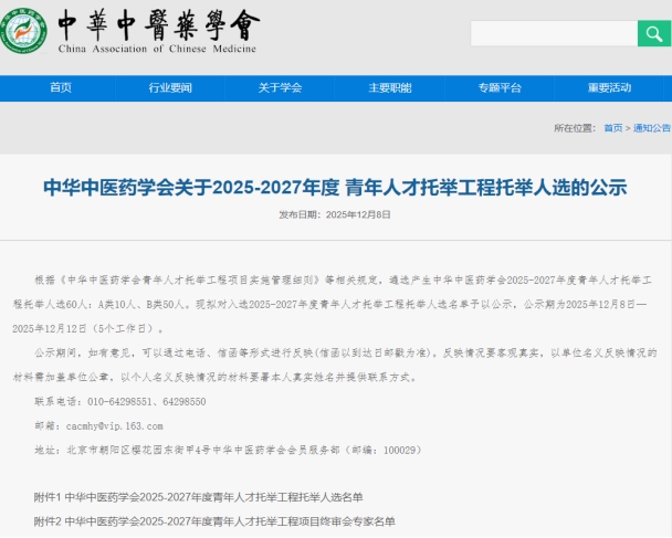 中华中医药学会2025-2027年度青年人才托举工程托举人选名单