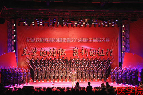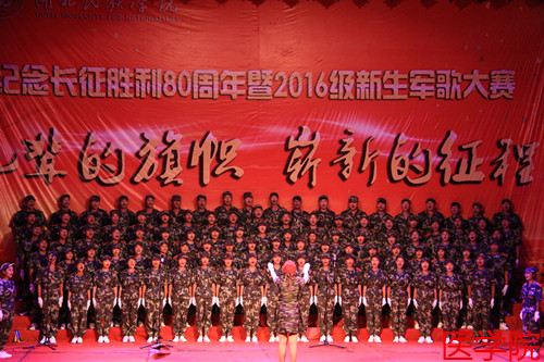 本网讯(记者 徐祎 陈灵佼/文 黎锐/图)为纪念长征胜利80周年暨“九一八事变”95周年,9月18日,我校2016级军歌大赛在大学生广场隆重举行。音乐舞蹈学院兰宏建老师、黄玉林老师、谷秋阳老师、谷穗老师、陈超老师应邀担任评委,各二级学院党委书记、学生科老师莅临现场。大赛由文学与传媒学院的董圣洁同学和民族学与社会学学院的王伟文同学主持。