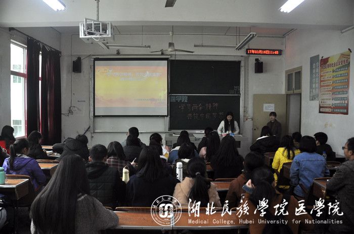 活动伊始,唐娜简要介绍了2017年两会的内容。随后,她播放了我国卫计委主任李斌在两会记者会中谈及卫生计生事业改革发展的视频。她谈道,作为一名共青团员,应培养责任意识;而作为一名医学生,则应该关注国家医疗卫生事业,深入了解国家医疗卫生发展动态。随后,唐娜以共筑"健康中国"为切入点,和大家一起展开讨论了作为一名医学生在共同实现这一梦想时应当怎样做的问题。来自16级16支部的黄国庆同学及21支部的任莹芳同学分别发表了自己的见解,谈及医学生应扎实学习基础理论知识、多了解医院体制、多进行临床实践、学习医患关系处理方式等内容。