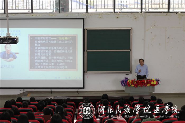 本网讯(通讯员 郭曼 姚涛 方琼/文 周蕾/摄)4月14日晚,由我院主办的名医名师大讲坛专题三“心系患者,大医精诚”活动在修远楼5B404教室开讲,武汉大学人民医院及湖北省人民医院中医科主任宋恩峰担任主讲嘉宾,我院相关专业两百余名学生参加了此次讲座。