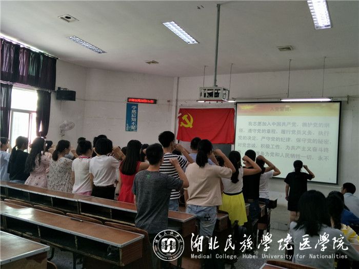 大会第一项,全体起立奏唱国际歌。大会第二项,张蕊老师宣读本学期预备党员名单。大会第三项,工作人员分发党徽。大会第四项,正式党员李思带领同学们宣读党的誓言。大会第五项,2017年预备党员代表阮泽坤同学发言。他讲到,从交入党申请书到成为预备党员这一段时间,他收获了很多,对党组织有了更加深刻的了解,在思想上有了极大转变。同时,他作出三点保证:第一,努力提升自己的思想政治修养,始终保持乐观向上的精神状态。第二,全心全意为人民、为同学服务,充分发挥模范带头作用,积极贡献自己的力量。第三,求真务实,脚踏实地地学好医学专业知识,树立终身学习的观念,争取早日成为一名优秀的党员。接着,由正式党员代表李思发言,他提出了作为一名党员应该做到的三点:第一,认真学习;第二,无论是党员还是预备党员,我们都要有共同的理想信念;第三,时刻谨记自己的初心,为党和人民作出贡献。大会最后一项,党委书记刘红为本次大会作总结。刘书记恭喜大家顺利成为一名预备党员。他指出,成为一名预备党员后应时刻谨记自己的责任,要时刻起到模范带头作用,记住自己的初心,并时刻谨记入党誓词,规范自己的行为,增长本领,早日成长为一名真正的党员,真正的成为中国特色社会主义合格的竞选人和可靠的接班人。