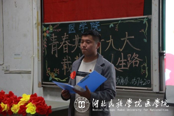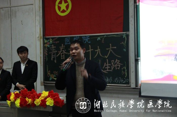 本网讯(记者 郭曼 /文 通讯员 张向伟/摄)11月20日,我院团委宣传部于8104教室成功举办主题为"青春共话十九大,载梦奋进人生路"的团日活动之朗诵比赛。我院团委书记张鼎老师,团委副书记张雯琛、杨印庆,学生会副主席张飞,中共湖北民族学院医学院学生党建委员会主席张洁、副主席彭雯、孙奎等应邀出席并担任评委。17级200余名新生参与本次活动。
