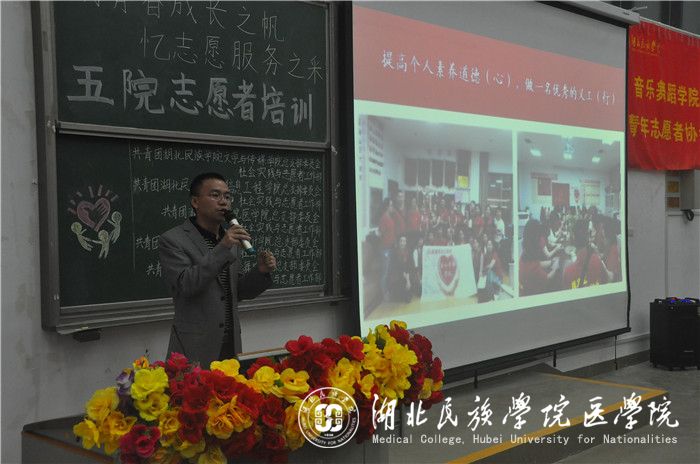 本网讯(通讯员 黎晓容 刘峻银/文 吕丰旭/摄)为使志愿者更进一步了解志愿活动,提高我校青年志愿者综合素质水平,5月4日,我校在5B403教室召开了“2018年五院志愿者培训大会”。本次活动由我院、文学与传媒学院、信息工程学院、美术与设计学院和音乐与舞蹈学院五院的社会实践与志愿者工作部联合主办,恩施义工协会策划部部长严书田、会员部部长赵俪出任特邀嘉宾。校团委相关负责人及五院120余名青年志愿者参加此次培训。