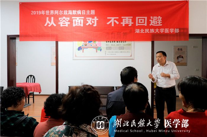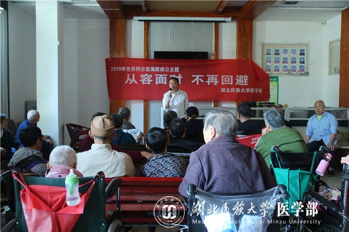 本网讯(记者 饶静 郭恩惠/文 崔玉娇 吴亚辉/摄)2019年9月21日为“世界阿尔兹海默病日”,为及早防治阿尔兹海默病(即老年痴呆症),我校专门从事阿尔兹海默病研究的罗洪斌博士和40余名本科生、研究生在内的医学部志愿者专程到恩施市解放路老街坊敬老院开展主题为“从容面对,不再回避”的阿尔茨海默病防治知识宣讲活动,同时还对现场的老年朋友们进行了老年人精神状态和学习记忆能力调查,建立了认知功能健康档案。
