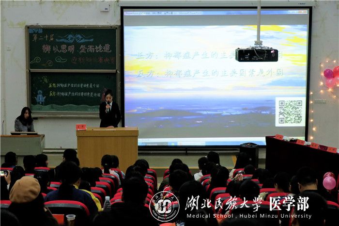 本网讯(记者 郭恩惠 通讯员 李东/文 吴亚辉/摄)为锻炼学生思辨能力,增强其综合素质,11月8日,由医学部学生工作办公室主办、学生会学风建设部承办的以“辩以思明,坐而论道”为主题的迎新辩论赛决赛在我校修远楼5B403教室圆满落幕。医学部人体解剖教研室老师李震阳、研究生与学科建设管理办公室老师孙宇、学生工作办公室老师艾尔肯·吾斯曼、优秀辩手汪鑫、黄国庆应邀担任评委。医学部近二百名学生观看了本场比赛。