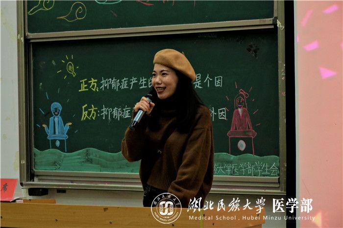 本次比赛正、反两方代表队以“抑郁症产生的主要原因是个因还是外因”为主题展开辩论。双方开篇立论对本方观点进行了陈述。在攻辩及自由辩论环节中,反方以“张国荣”、“崔雪莉”事件对本方观点进行辩论,正方则紧扣两人自身原因进行反驳。在最后的总结陈词环节中,双方四辩在指出对方辩论漏洞的同时,再一次总结自身观点。最后,孙宇老师为本场辩论赛作点评,希望同学们能在以后的生活中不忘医者初心,牢记健康使命。最终,反方代表队以82.475的高分夺得胜利,反方二辩罗语桐荣获最佳辩手称号。