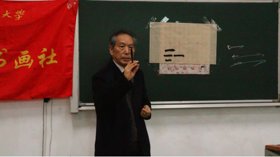 活动伊始,余中权老师科普如何正确选用毛笔、如何正确握笔、如何使用正确的姿势书写:选用厚、中锋、狼毫的毛笔;握笔拇指和食指自然地捏住笔,中指抵住笔,无名指和食指顺势放在中指下面。接着余老师带领学生们一起用正确的方式进行书写,并纠正现场同学的错误姿势,让同学们融会贯通、活学活用,最后由社团的学长学姐带领练习,让社团同学们更好理解相关知识。