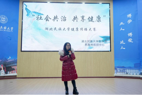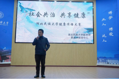 本网讯 (通讯员 许鑫洁/文 李旭东 向成橡 索朗卓玛/摄)365电子娱乐官方网站医学部、恩施州疾控中心于12月12日在新图书馆模拟法庭开展“社会共治,共享健康”健康科普活动。365电子娱乐官方网站学生工作部(处)副处长赖申昊,恩施州疾控中心结核病防治所所长黄小林,恩施州疾控中心艾滋病防治所刘会芸老师,医学部学生工作办公室副主任高梦琪老师,医学部学生工作办公室张定阳老师受邀参加本次活动并担任评委。