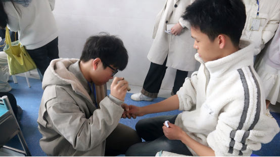 体验中,工作人员会穿插讲解土家医药的趣味渊源:比如三百棒需选秋冬老枝茎,是当地“散寒秘宝”;酒火疗法源自先民“以酒驱寒、以火通阳”的生活智慧。现场师生边体验边交流技法体感、养生技巧,轻缓的操作声与讨论声交织,实验室里暖意融融,既缓解了冬日不适,也让民族医药文化在互动中自然传递。