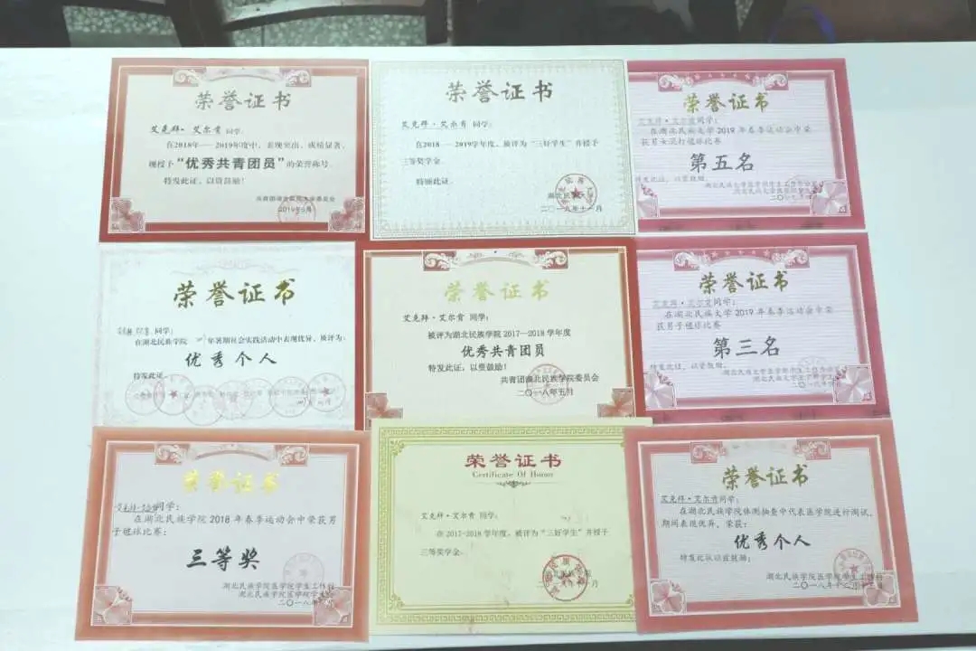 学业的精深造诣来源于勤奋好学,只有好学者,才能在无边的知识海洋里猎取到真智才学,“我是一名疆籍学生,虽然基础不乐观,但我还是克服了语言障碍,我的勤奋换来了任课老师和同学们的肯定,获得了各个老师及每位同学的好评和称赞。”这四年的刻苦学习和努力拼搏让他能够在每个学期学习成绩都跻身于年级前列,班级第一。 他也曾多次获得国家励志奖学金、“三好学生”、“优秀共青团员”。