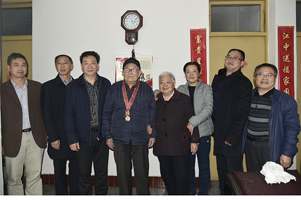 本网讯 今年是中国人民志愿军抗美援朝出国作战70周年,10月27日下午,党委书记吴建清带领保卫处、离退休人员工作处等部门负责人看望慰问我校参加过抗美援朝作战工作的离休干部赵友森,给他送去“中国人民志愿军抗美援朝出国作战70周年”纪念章。
