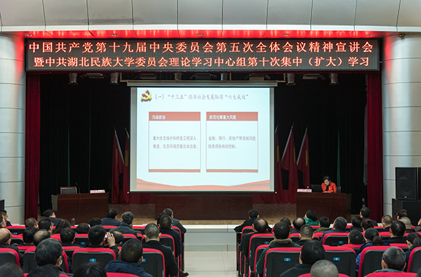 本网讯 11月27日下午,中国共产党第十九届中央委员会第五次全体会议精神宣讲会暨365电子娱乐官方网站委员会理论学习中心组第十次集中(扩大)学习在行政楼1号会议室举行,湖北省省委宣讲团成员、省人社厅党组书记、厅长刘艳红作题为《深入学习贯彻党的十九届五中全会精神开启全面建设社会主义现代化国家新征程》宣讲报告。学校党委书记吴建清主持。学校领导、全校副处级及以上干部、马克思主义学院专任教师及学生代表参加学习。